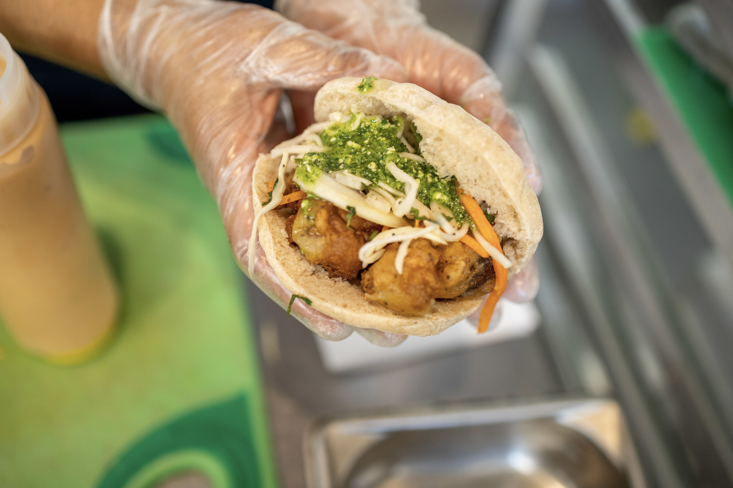 A new sandwich just started testing today at CloverKND. Chipotle mayo, cornmeal-battered crimini mushrooms, cabbage slaw, and a cilantro pesto that we all went wild for.